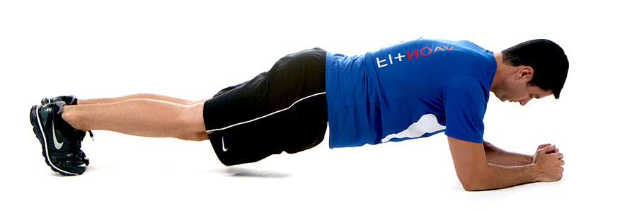 Depois levante o quadril, mantendo-se apoiado apenas pela ponta dos pés e pelos cotovelos.