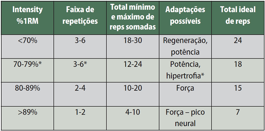 (*) Nestes percentuais, os programas de bodybuilding tipicamente preconizam 8 a 10 repetições, enquanto muitos atletas de força raramente ultrapassam 5.