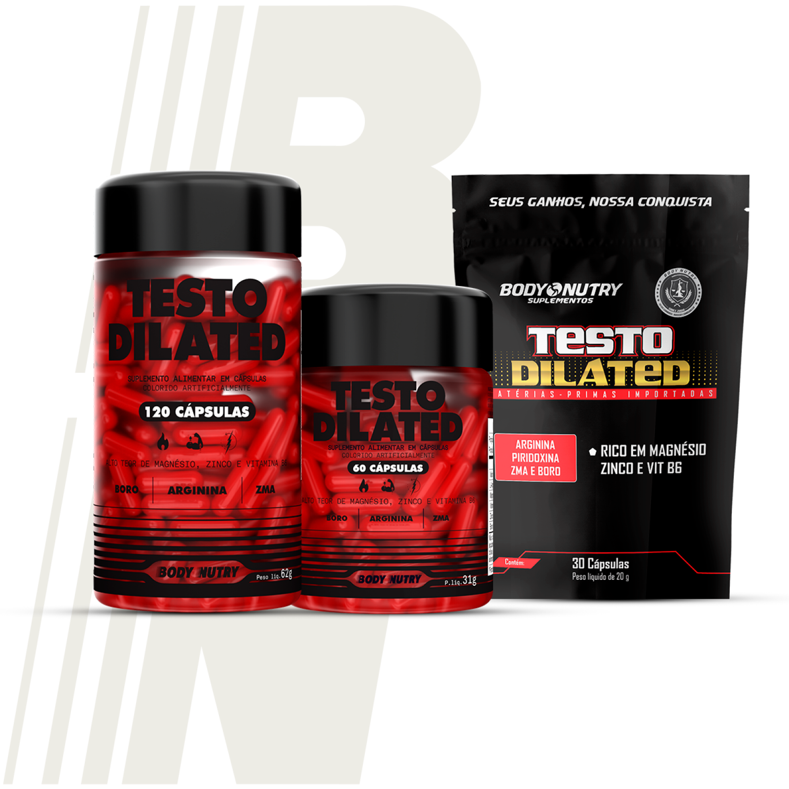 O Testo Dilated é um suplemento 100% natural, formulado com L-Arginina, Magnésio, Vitamina B6, Zinco e Boro.